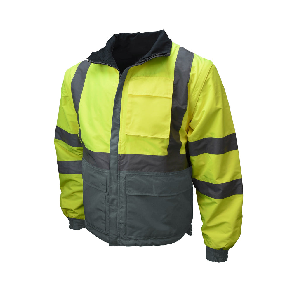 The Radians SJ07-3ZDS Reversible Windbreaker with Zip-Off Sleeves is an all-purpose, 4-in-1, windbreaker provides superior, cross-seasonal comfort and weather protection. Reverses from dark, low-profile grey to bright, hi-vis yellow. The zippered sleeves allow the Class 3 hi-vis jacket with sleeves to easily convert to a Class 2 hi-vis vest without sleeves.
