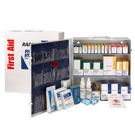 - RADNOR™ 3 Shelf First Aid Cabinet without Medications in a solid steel case comes with a carrying handle and is wall mountable. Contents exceed the 2021 ANSI Class B requirements and are sufficient to treat 100 to 150 people.