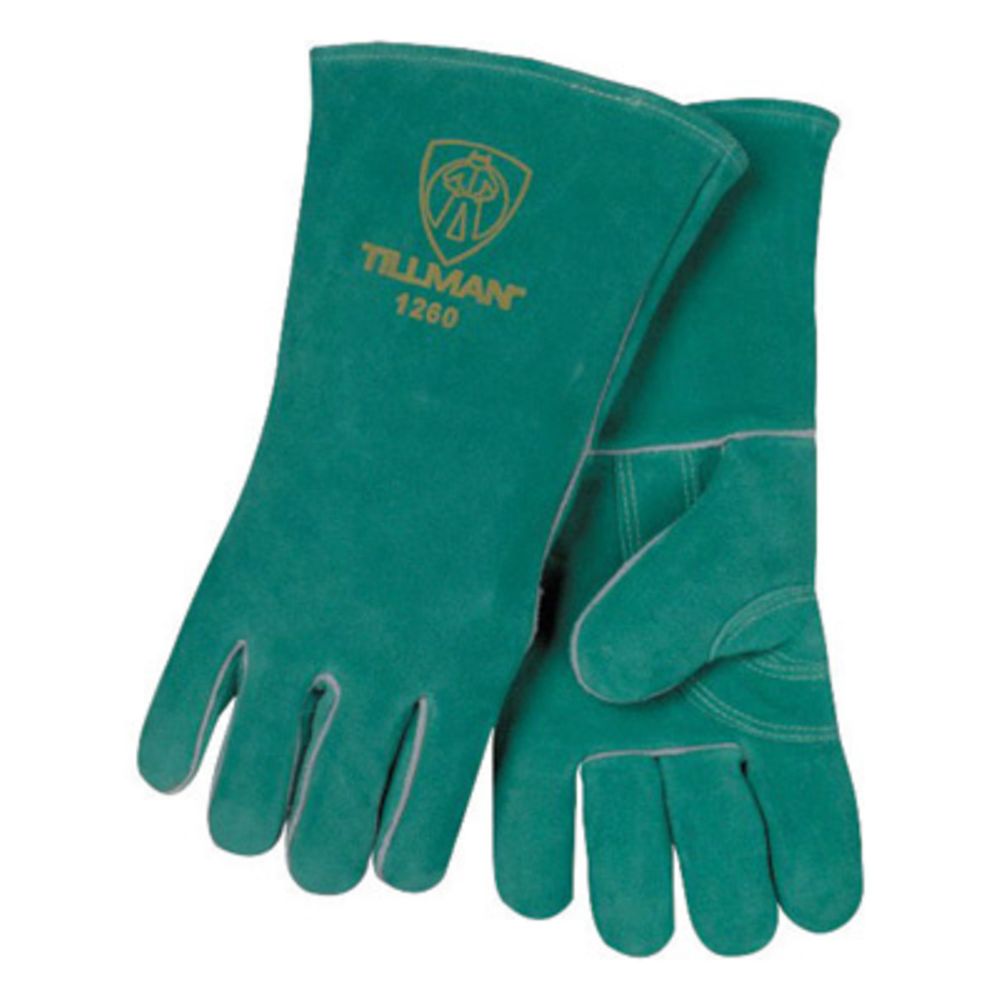 Tillman Large 14" Green Welder Gloves with double reinforced thumb have a cowhide side split construction and are insulated with cotton/foam lined material. They are lock stitched with Kevlar thread for extra strength and the stitching is secured by the welted fingers. DuPont and Kevlar are trademarks or registered trademarks of E.I. du Pont de Nemours and Company.